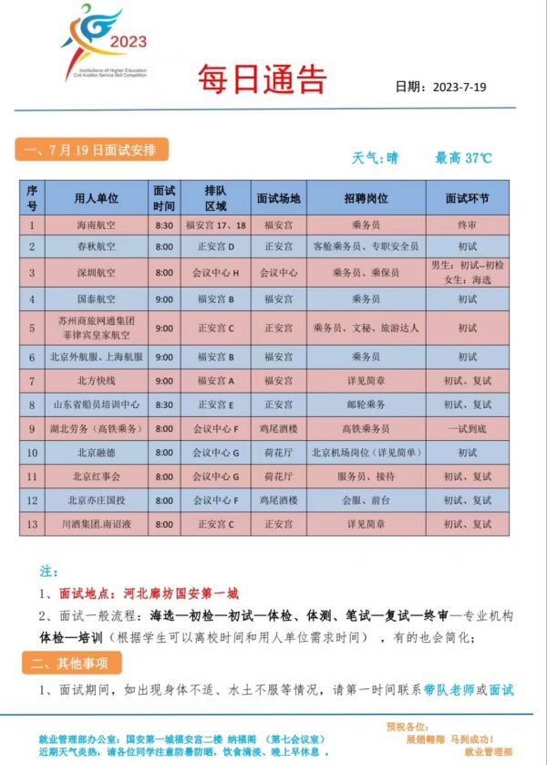7 月 18 日供需對接就業(yè)活動第二天,共有 8 家單位進駐現(xiàn)場,展開招聘及宣講,分別是:中國南方航空、中國東方航空(包含中聯(lián)航、東漢江蘇分公司、東航成都分公司及東航旗下其他分子公司)、海南航空、廈門航空、九元航空、江西航空、長龍航空、內蒙古空港貴賓。 7 月,光熱碰撞,清風蟬鳴,民航學子們與夏天相遇,與夢想相擁。據統(tǒng)計,今日面試總人次達 12877 人,通過面試人數為 2426 人。